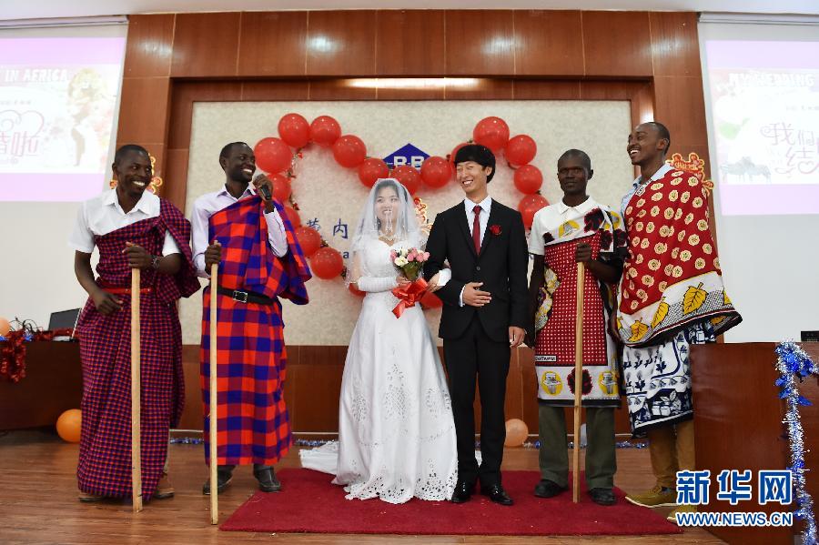 5月2日,在肯尼亚内罗毕的蒙内铁路第八标段,身着马赛族服饰的肯尼亚员工为90后新人慕旭强(右三)和李祉缘(左三)送上祝福。当日,在中国路桥工程有限公司承建的蒙巴萨-内罗毕铁路第八项目部营地,一对90后中国新人在中肯员工的共同见证下喜结连理。新郎是子承父业、2012年扎根非洲的北京小伙慕旭强;新娘是留学英国、2014年奔赴非洲的内蒙古女孩李祉缘。他们因参与建设蒙内铁路而相遇、相知,最终步入婚姻殿堂。婚礼现场,美丽新娘的身后是两名身着白裙的肯尼亚小女孩,他们用小手高高举起巨大的婚纱拖尾,露出纯洁神圣的微笑。当地男员工披起红色方格布,手持长棍,神似马赛武士,女员工套上精致小红裙,戴起红色耳环,如同画中人物。在人力资源部门工作的肯尼亚员工本森·马萨沃说:“婚礼的每一个细节都令我感动,我将永远不会忘记这个重要时刻,是我们的中国朋友邀请我们参加了这个婚礼仪式。” 新华社记者孙瑞博摄