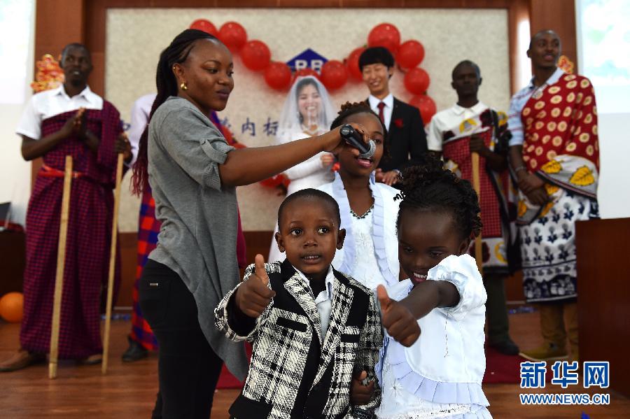 5月2日,在肯尼亚内罗毕的蒙内铁路第八标段,参加婚礼的肯尼亚孩子在仪式现场为新人慕旭强和李祉缘朗诵诗歌送上祝福。当日,在中国路桥工程有限公司承建的蒙巴萨-内罗毕铁路第八项目部营地,一对90后中国新人在中肯员工的共同见证下喜结连理。新郎是子承父业、2012年扎根非洲的北京小伙慕旭强;新娘是留学英国、2014年奔赴非洲的内蒙古女孩李祉缘。他们因参与建设蒙内铁路而相遇、相知,最终步入婚姻殿堂。婚礼现场,美丽新娘的身后是两名身着白裙的肯尼亚小女孩,他们用小手高高举起巨大的婚纱拖尾,露出纯洁神圣的微笑。当地男员工披起红色方格布,手持长棍,神似马赛武士,女员工套上精致小红裙,戴起红色耳环,如同画中人物。在人力资源部门工作的肯尼亚员工本森·马萨沃说:“婚礼的每一个细节都令我感动,我将永远不会忘记这个重要时刻,是我们的中国朋友邀请我们参加了这个婚礼仪式。” 新华社记者孙瑞博摄
