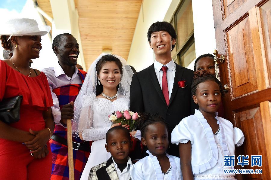 5月2日,在肯尼亚内罗毕的蒙内铁路第八标段,90后新郎慕旭强和新娘李祉缘与肯尼亚员工们合影。当日,在中国路桥工程有限公司承建的蒙巴萨-内罗毕铁路第八项目部营地,一对90后中国新人在中肯员工的共同见证下喜结连理。新郎是子承父业、2012年扎根非洲的北京小伙慕旭强;新娘是留学英国、2014年奔赴非洲的内蒙古女孩李祉缘。他们因参与建设蒙内铁路而相遇、相知,最终步入婚姻殿堂。婚礼现场,美丽新娘的身后是两名身着白裙的肯尼亚小女孩,他们用小手高高举起巨大的婚纱拖尾,露出纯洁神圣的微笑。当地男员工披起红色方格布,手持长棍,神似马赛武士,女员工套上精致小红裙,戴起红色耳环,如同画中人物。在人力资源部门工作的肯尼亚员工本森·马萨沃说:“婚礼的每一个细节都令我感动,我将永远不会忘记这个重要时刻,是我们的中国朋友邀请我们参加了这个婚礼仪式。” 新华社记者孙瑞博摄