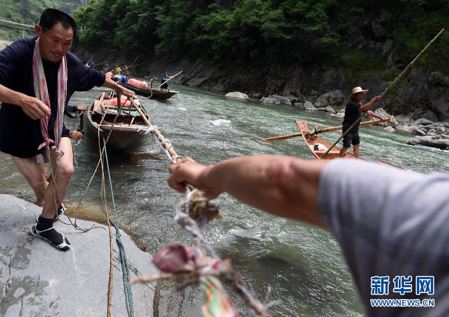 4月30日,湖北巴东县双神游客接待中心外,被当地人称为“桡夫子”的纤夫们登上一条称为“豌豆角”的木船,往神农溪的上游划去。这是“桡夫子”“重出江湖”的一场“试漂”。近年来,巴东县招商引资近2亿元,对神农溪上游进行综合开发。5月1日,该县举行神农溪纤夫文化走廊“首漂”,“桡夫子”正式“重出江湖”。 2009年,三峡大坝蓄水至175米,因为险、奇、秀而被誉为“神州第一漂”的神农溪漂流没入水下,一些“桡夫子”转战绵竹峡从事表演性拉纤,另一些则彻底转行,外出打工。传统意义上的拉纤消失了。巴东县旅游局局长李前兵介绍说,“桡夫子”早在20世纪50年代出现,那时神农溪两岸交通闭塞,生产生活资料的运进运出全靠木船,“桡夫子”这份职业是惹人羡慕的“香饽饽”。20世纪80年代末,随着公路修通、旅游业方兴未艾,“桡夫子”们转而为慕名前来的游客提供漂流服务。如今,神农溪的纤夫成为三峡古老拉纤文化的活化石,他们雄浑、粗犷的号子将重新响彻山谷,震撼心灵。 新华社记者 肖艺九 摄