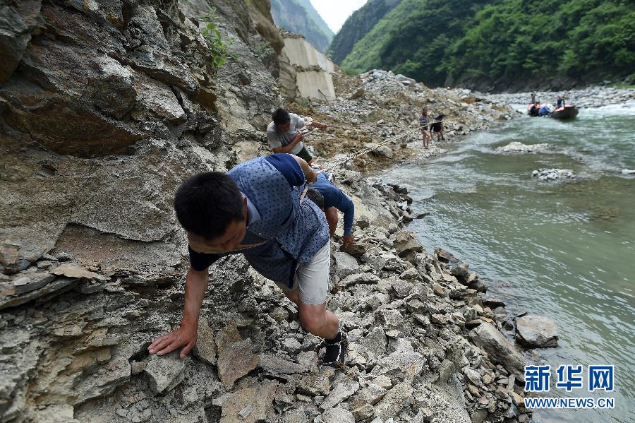56岁的纤夫沈千权在神农溪旁拉纤(4月30日摄)。