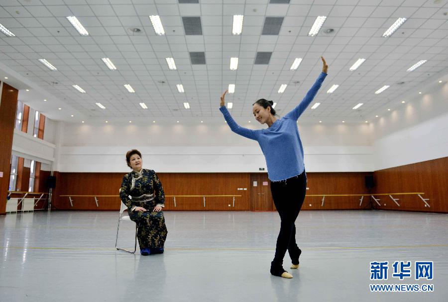 5月6日,在内蒙古民族艺术剧院歌舞团排练大厅,娜荷雅(右)为从阿拉善右旗老家来到剧团看望自己的妈妈陶高斯表演舞蹈《鸿雁》。娜荷雅从7岁开始在妈妈的陪伴下学习舞蹈,于2008年以优异的成绩考入内蒙古民族艺术剧院歌舞团。 新华社发(王正 摄)