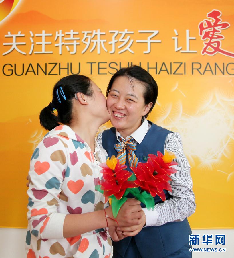 5月6日,在山东省滕州市特教中心学习的“女儿”张志茹(左)亲吻“代理妈妈”徐圣洁,并送上自己刚做的“鸿运当头”丝网花,祝福“妈妈”。徐圣洁自2007年起与听障“女儿”张志茹结成帮扶对子。8年来,徐圣洁一直照顾着张志茹的学习和生活,用心呵护“女儿”成长。 新华社发(宋海存 摄)