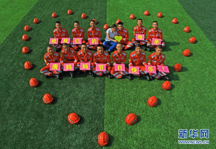 5月6日,在武警重庆总队七支队救援中队,李涛(后右三)与队中战友一起坐在地面上,用头盔围成一个心形,为身旁的妈妈送上节日的祝福。 新华社发(曹峰 摄)