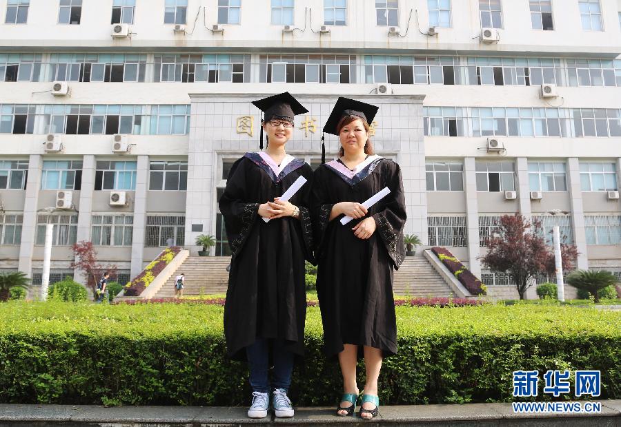 5月7日,在湖南衡阳南华大学,医学院大一学生陈俏慧(左)借来学士服,陪妈妈陈平秀在校图书馆前留影,帮妈妈圆一个大学梦。陈俏慧的妈妈陈平秀是从小生活在农村,因家中孩子多,条件有限,只读完小学,就告别了校园。成为大学生的陈俏慧在一次回家的时候,偶然感知妈妈藏在心里多年的大学梦。在校方的大力支持下,她于母亲节前带着妈妈来到大学,开始了妈妈的圆梦之行。 新华社发(曹正平 摄)