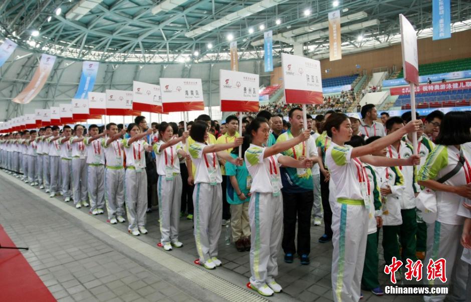 5月11日下午,全国第九届残运会暨第六届特奥会特奥游泳项目在成都高新区开赛。开赛仪式在雄壮的国歌声中拉开帷幕,运动员代表、裁判员代表分别就公平竞赛和公正执裁宣誓。据介绍,本次特奥游泳比赛分成5个年龄阶段分别进行。来自全国22个省、市、自治区和香港、澳门特别行政区23支运动队(四川有两支运动队)、108名运动员参加比赛。王伟 摄