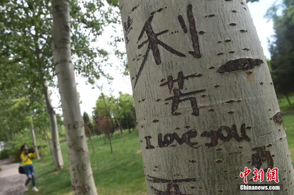5月11日,山西太原汾河景区,200余棵直径三四十厘米的杨树树干上,被刻满各类“爱情誓言”,甚至污言秽语。景区管理人员表示,游人破坏树木的不文明行为屡禁不止,现在景区已安排监察队员与保安人员加强巡查,希望广大游客文明游园,共同维护景区良好环境。武俊杰 摄