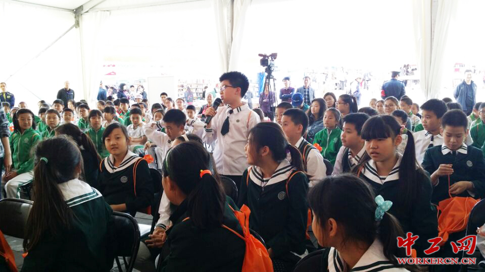 2015年5月11日下午,芳草地国际学校日坛校区,德育处组织四年级学生到朝阳公园参加了“书香溢京城 全民享阅读”的读书活动,同学们与作家虹影合影留念。( 芳草地通讯员 张睿 张静)