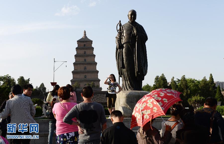 游客在西安大雁塔玄奘像前合影留念(5月11日摄)。大雁塔是唐代玄奘法师为保存由天竺经丝绸之路带回长安的经卷佛像而修建的。在陕西西安这座古老的城市,许多具有印度风情的元素成为中印文化交流的最好见证。 新华社记者 刘潇摄