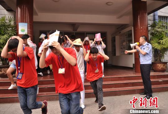 5月14日,在学校老师和辖区派出所民警引导下,重庆一职业学院集中学习和演练在地震突发时的正确疏散逃生方式。