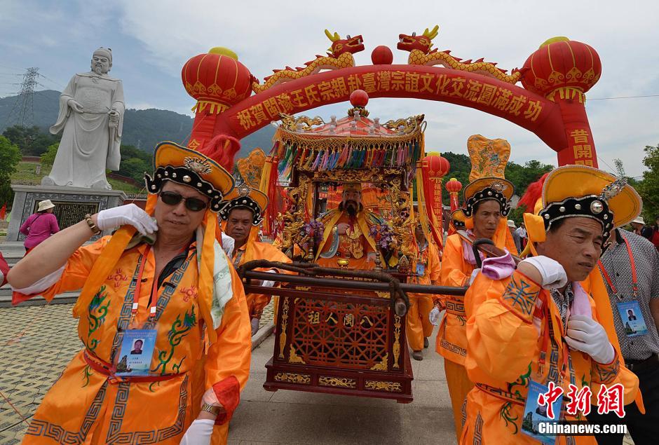 5月14日,开闽“三王”金身赴台会香巡安起驾仪式在福州举行,300名闽王宗亲后人将护驾金身渡海,往台湾中北部开展为期10天的绕境祈福活动。唐朝王潮、王审邽、王审知三兄弟被两岸民众尊为为开闽“三王”,公元885年三王从河南光州固始入闽,福建成就霸业。千年之间,闽王后人遍及海内外,目前在台湾就有近50万王审知后裔。张斌 摄