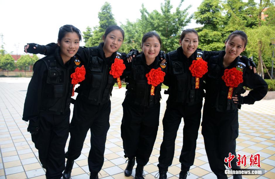 5月17日,即将毕业离校的防暴队女队员。当日,首支大学生“反恐防暴队”毕业学员退队仪式在成都某专修学院举行。40余名佩戴着大红花的“老兵”面向国旗敬礼,摘下肩章,向新队员告别。据悉,该批防暴队队员因完成学业毕业,即将走上新的岗位。中新社发 陈东 摄
