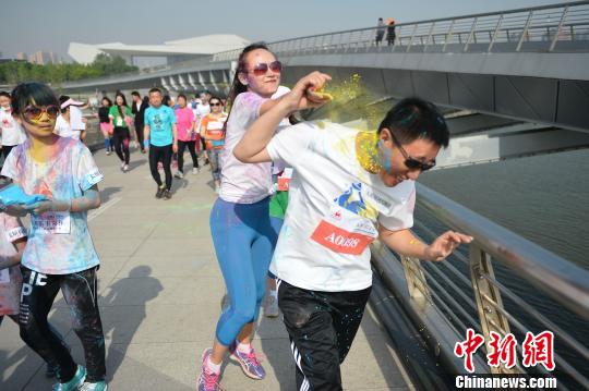 5月17日,山西太原汾河景区,近千名年轻人参加彩色跑比赛,释放年轻活力,享受色彩青春。 武俊杰 摄