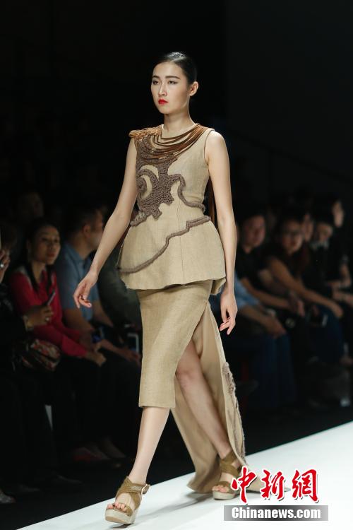 5月17日,模特在T台上展示苏州大学艺术学院毕业生的时装作品。当日,2015苏州大学艺术学院毕业生作品发布会在北京举行。本次毕业生作品发布主题立足本土文化,从江南特有的风土人情汲取设计灵感,将民族文化的精髓,江南生活的雅致,传统手工艺的脉络与现代时尚的潮流融合一体。 中新社发 盛佳鹏 摄