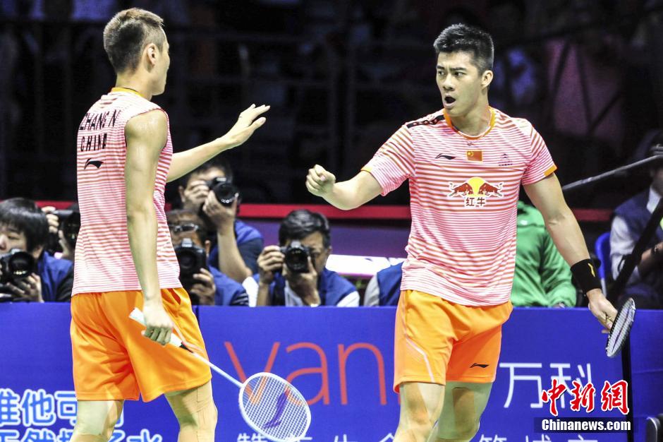 5月17日, 中国队选手张楠/傅海峰在男双比赛中以2比1战胜日本队选手远藤大由/早川贤一,为中国队先下一城。当日,2015苏迪曼杯世界羽毛球混合团体锦标赛决赛在广东东莞市篮球中心举行,中国队对阵日本队。 中新社发 韩海丹 摄