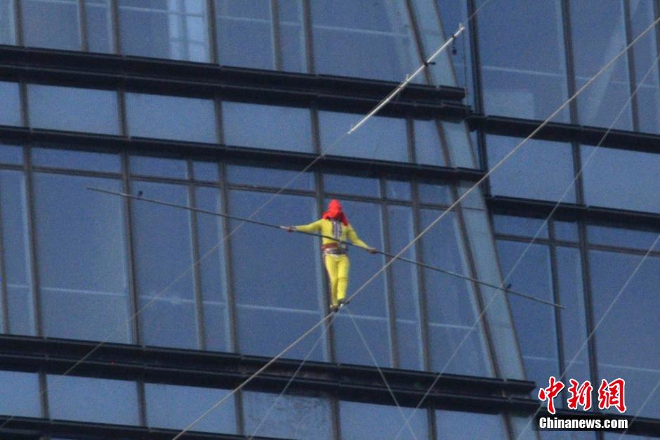 5月16日18时,“高空英雄”艾斯凯尔挑战中国最高双塔的昆明万达广场300米双塔,并成功冲击蒙眼倒走钢丝世界纪录。本次挑战的楼层是双塔中部第32层,距地面150米,艾斯凯尔用红布包头蒙住双眼,倒走钢丝,从南塔用时6分40秒成功走至北塔。随后艾斯凯尔又数次往返双塔并完成一些高难度的高空表演。 中新社发 李伟华 摄