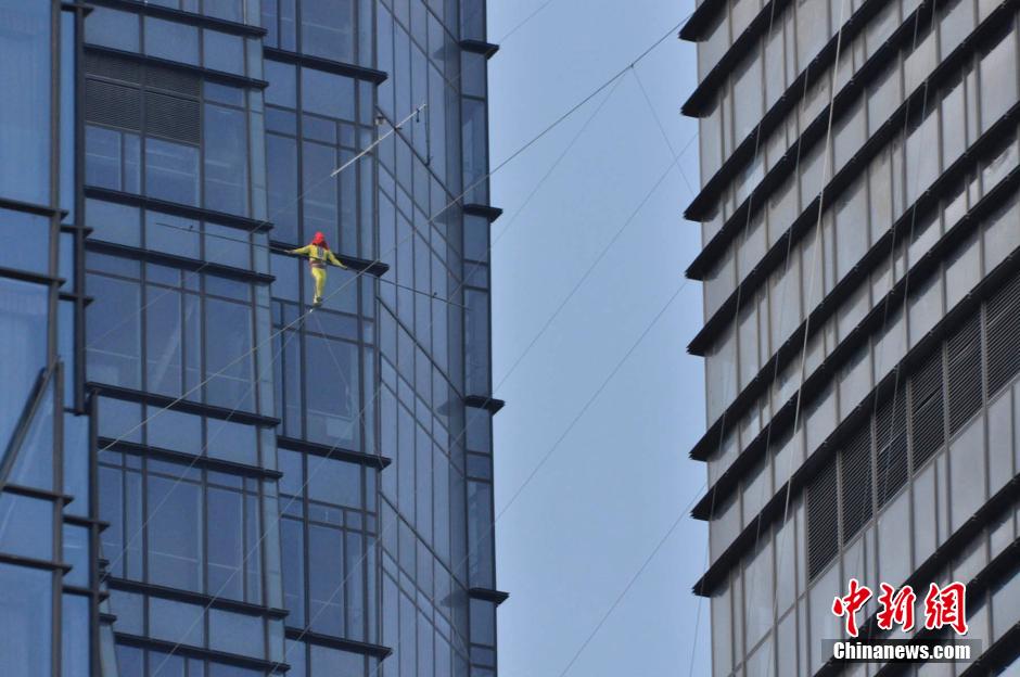 5月16日18时,“高空英雄”艾斯凯尔挑战中国最高双塔的昆明万达广场300米双塔,并成功冲击蒙眼倒走钢丝世界纪录。本次挑战的楼层是双塔中部第32层,距地面150米,艾斯凯尔用红布包头蒙住双眼,倒走钢丝,从南塔用时6分40秒成功走至北塔。随后艾斯凯尔又数次往返双塔并完成一些高难度的高空表演。 中新社发 李伟华 摄