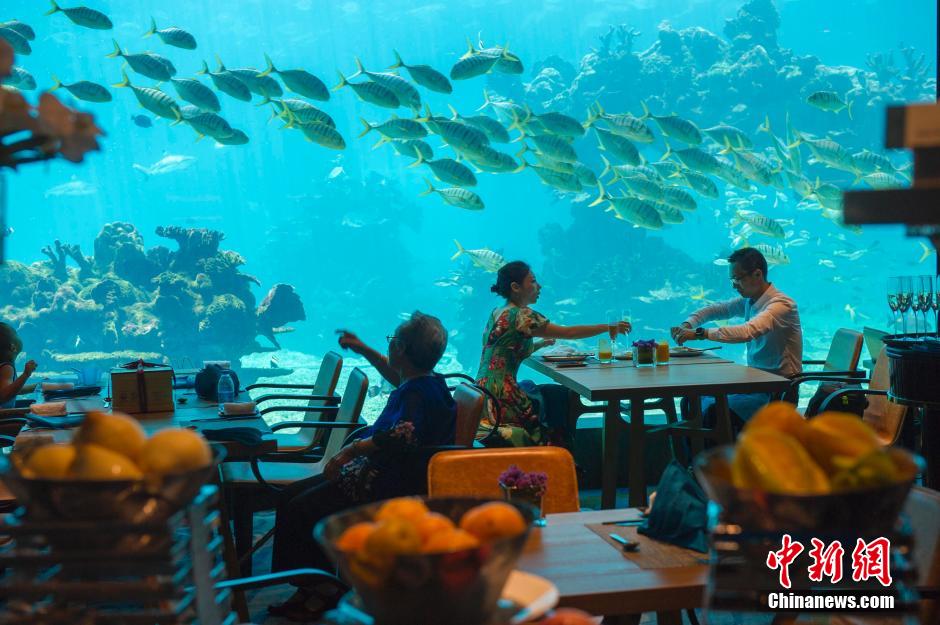 海南省三亚市委副书记、市长吴岩峻接受中新社“一带一路”专题报道组采访时说“未来我们将推动几大海湾差异化发展”,主管海棠湾建设几年,吴岩峻对这个定位为“国家海岸”的湾区情有独钟。“海棠湾滨海一线已建成11个由国际酒店集团管理的酒店、世界单体建面最大的免税店,还将有游客参与性很强的升级版度假酒店亚特兰蒂斯、梦幻不夜城等综合旅游项目陆续建成,这将是一个综合性度假湾区。来三亚的游客如果想非常安静地与大自然接触,就去亚龙湾;想玩拖曳伞、水上摩托艇、帆船、游艇等水上运动,我们还有三亚湾。”图为5月12日,三亚海棠湾天房洲际度假酒店的海底餐厅。 中新社发 骆云飞 摄