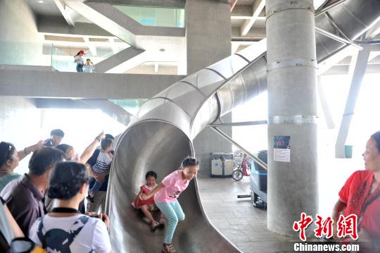 图为民众体验从企业三楼办公室到一楼的滑梯。 吕明 摄