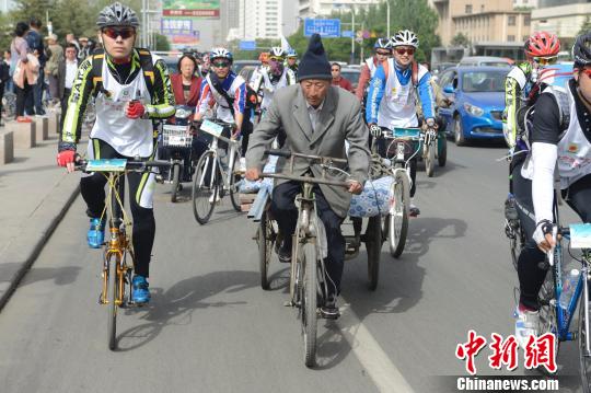 5月17日,2015呼和浩特首届千人骑行健身活动在市中心新华广场开幕,近千名市民参与“骑”乐无穷。骑行者从三轮车大爷身边经过。 刘文华 摄