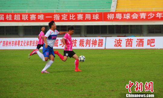 5月16日,第五届广西足球超级联赛(桂超联赛)开幕式在柳州市体育中心举行。来自广西9个城市的12支足球队,将在历时6个月联赛中进行68场比拼。图为比赛现场。 朱柳融 摄
