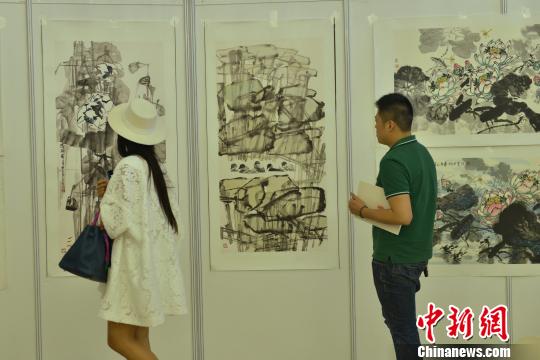 清莲世界书画展展出的作品吸引观众。张浪 摄