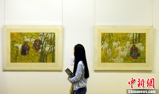 图为观众观看极具中国古典美的图式和贴金箔的技法的中国工笔重彩画。中新社发 张畅 摄
