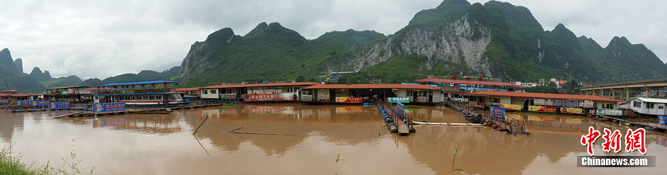 5月16日上午,桂江洪峰来临前,广西平乐县桂江上著名的“水上鱼村”停止营业,人员转移。由于连日暴雨不断,16日9时桂江洪峰水位达101.83米,超过警戒水位2.83米,流量7270立方米每秒。桂江河水上涨,导致平乐县城部分地段因排水受阻造成内涝受淹,全县大范围农田受淹,公路受淹、塌方,交通中断。该县立即启动“防汛三级响应”机制,动员广大党员干部群众,全力投入抗洪抢险工作中。中新社发 陶彩忠 摄