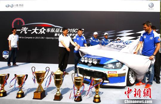 一汽-大众为征战2015年中国汽车拉力锦标赛(CRC)全新打造的第七代高尔夫战车5月16日在北京亮相,一汽-大众销售有限责任公司副总经理耶内尔先生与中国汽车运动联合会嘉宾、WRC名将克里斯·阿特金森,及冠军车手陈德安,李国静以及奥运射击冠军杨凌等共同出席了揭幕仪式。赵振清 摄