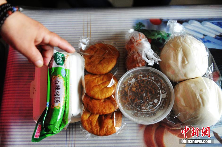 兰州城关区为重度残疾人配送的免费“爱心餐”很是丰富,有火腿肠、油饼、鸡蛋、馒头、面条、卤肉、以及各种小菜。杨艳敏 摄