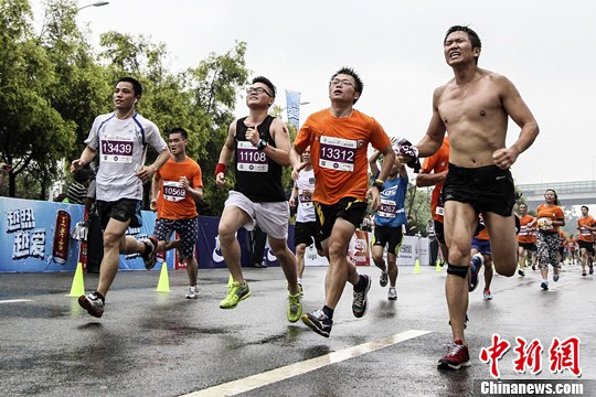 5月16日,2015广州10公里路跑赛在广州大学城鸣枪开跑,来自12个国家和地区,近6500名跑步爱好者在雨中参加了比赛。中新社发 黄晋文 摄