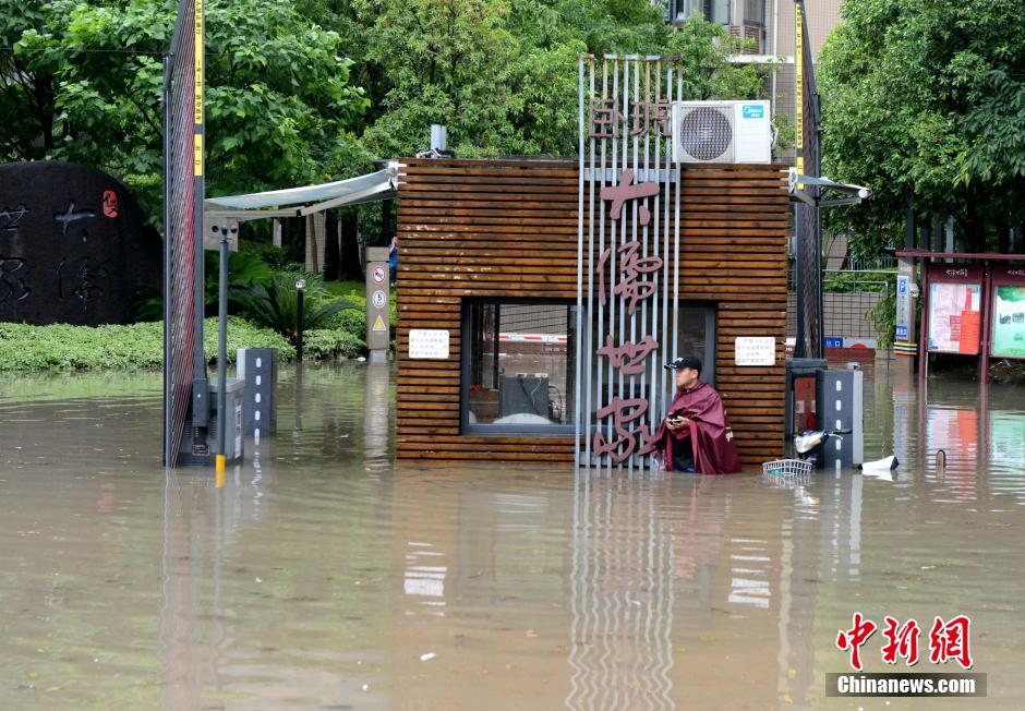5月16日下午,因强对流天气影响,福州市区电闪雷鸣,天空不由分说“倒下”倾盆大雨。福州多路段又重现“水漫金山”景象,网友戏称在家里可看海。图为福州大儒世家小区门口被淹。中新社发 王东明 摄