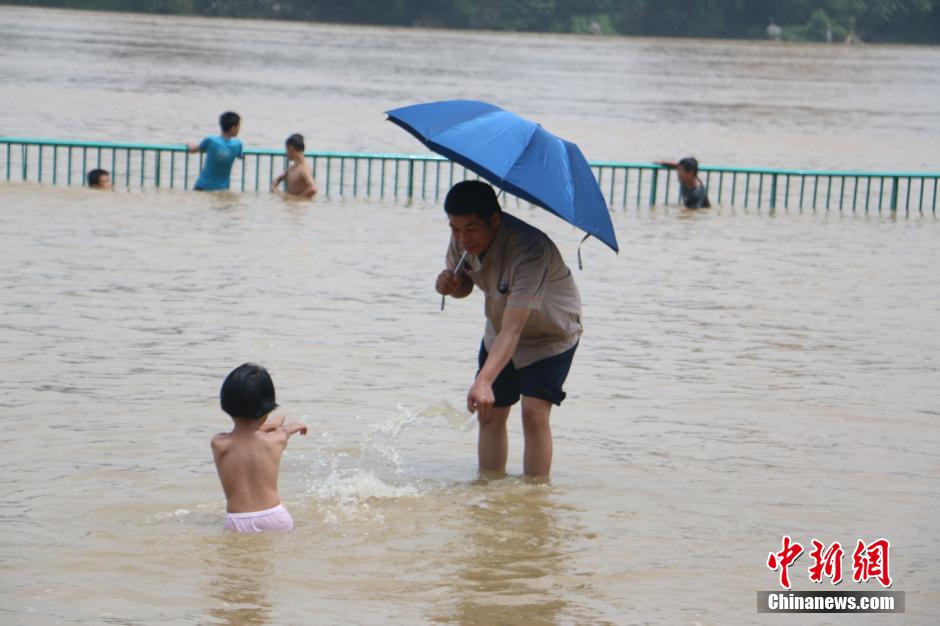 5月16日,受强降雨影响,广西柳州市柳江河市区河段水位上涨,漫过沿江金沙角亲水平台。当地市民来到涨水地段的水中取乐,打水仗、游泳、划充气艇等,十分惬意。据广西气象部门预计,14日晚起广西多地暴雨,本轮强降雨过程将于17日起逐渐减弱,但桂东、桂南地区仍会出现暴雨或短时雷雨大风等强对流天气。林馨 摄