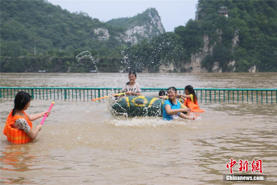 5月16日,受强降雨影响,广西柳州市柳江河市区河段水位上涨,漫过沿江金沙角亲水平台。当地市民来到涨水地段的水中取乐,打水仗、游泳、划充气艇等,十分惬意。据广西气象部门预计,14日晚起广西多地暴雨,本轮强降雨过程将于17日起逐渐减弱,但桂东、桂南地区仍会出现暴雨或短时雷雨大风等强对流天气。林馨 摄