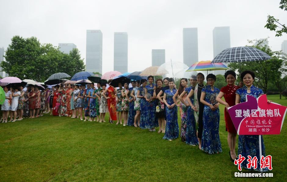5月16日,中国旗袍会湖南总会的千名会员们在长沙橘子洲沙滩公园举行“世界吉尼斯旗袍秀”。杨华峰 摄