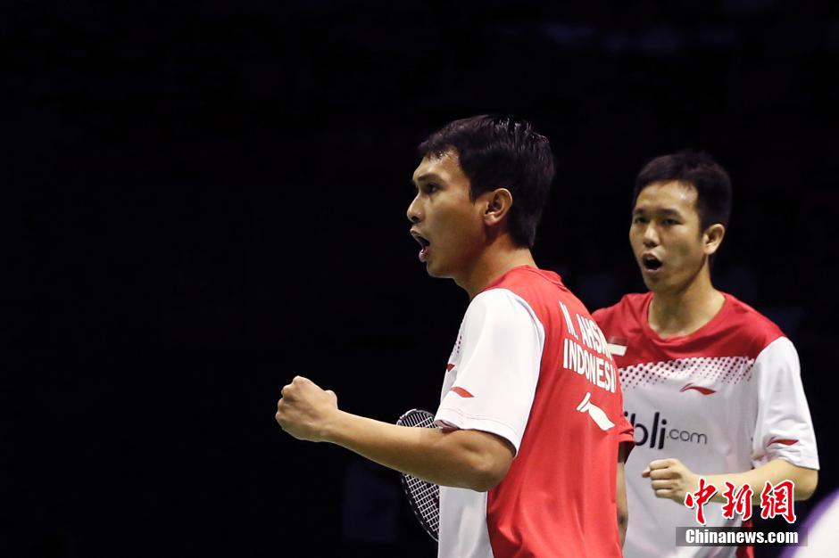 5月16日,中国队选手蔡赟傅海峰在男双比赛中以0比2负于印度尼西亚队选手亨德拉·塞蒂亚万/默罕穆德·阿山。当日,在广东东莞市篮球中心举行的2015苏迪曼杯世界羽毛球混合团体锦标赛半决赛中,中国队对阵印度尼西亚队。中新社发 韩海丹 摄