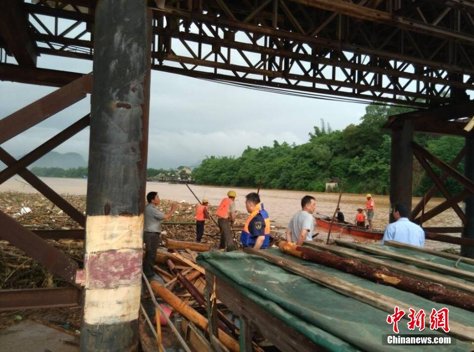 5月15日,广西北部遭遇暴雨袭击,融水县发布暴雨红色预警,当地三防镇三小时降雨量186毫米为百年罕见。大量木材等杂物被冲进融江河水并拥堵河道,当地海事部门全力动员应对处置,确保船舶、桥梁和航道安全。图为海事部门正在融江河上的桥梁处置险情。韦道忠 摄