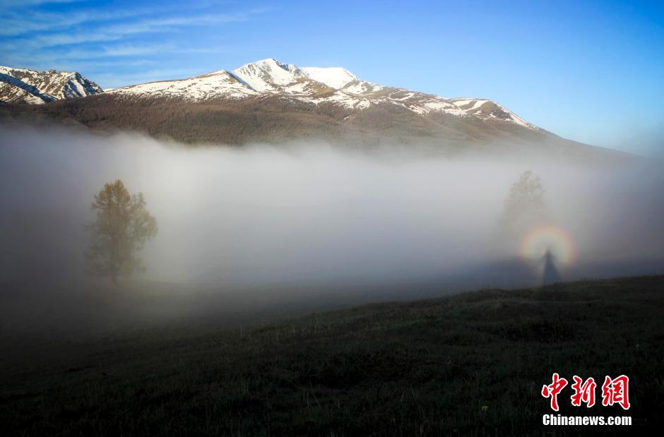 5月18日,新疆北部喀纳斯景区出现云海、佛光两大自然奇观。当日清晨,随着太阳慢慢升起,云海逐渐形成,翻滚在山谷间缓慢移动。站在景区制高点观鱼亭举目远眺,便可一览“云海填谷”的壮观景象。据介绍,喀纳斯湖位于景区山谷之间,加之景区内良好的植被,水汽蒸发蒸腾的量充足,每当太阳升起,水汽上升温度降低凝结成云,形成云海。中新社发 雷东翔 摄