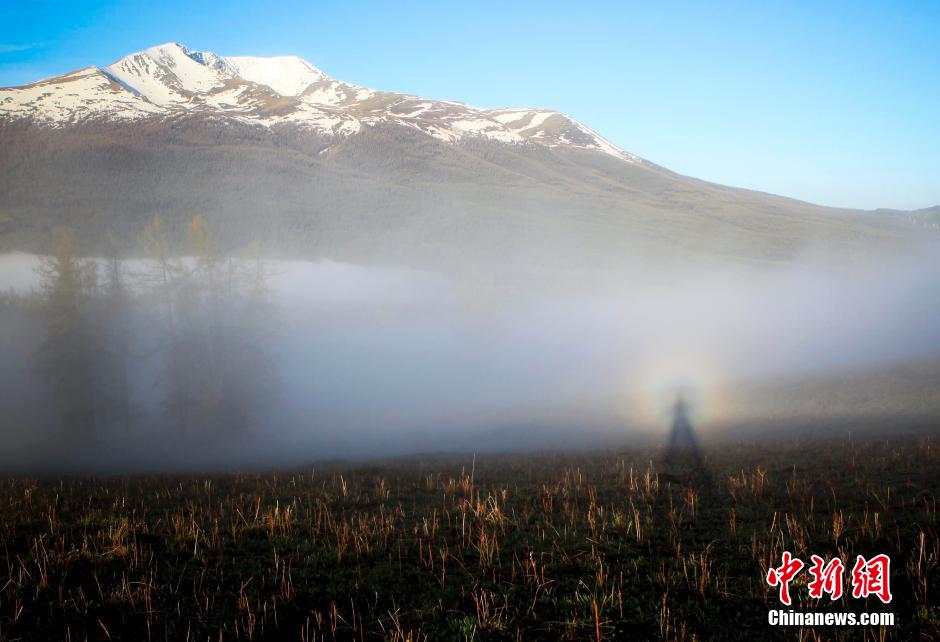 5月18日,新疆北部喀纳斯景区出现云海、佛光两大自然奇观。当日清晨,随着太阳慢慢升起,云海逐渐形成,翻滚在山谷间缓慢移动。站在景区制高点观鱼亭举目远眺,便可一览“云海填谷”的壮观景象。据介绍,喀纳斯湖位于景区山谷之间,加之景区内良好的植被,水汽蒸发蒸腾的量充足,每当太阳升起,水汽上升温度降低凝结成云,形成云海。中新社发 雷东翔 摄