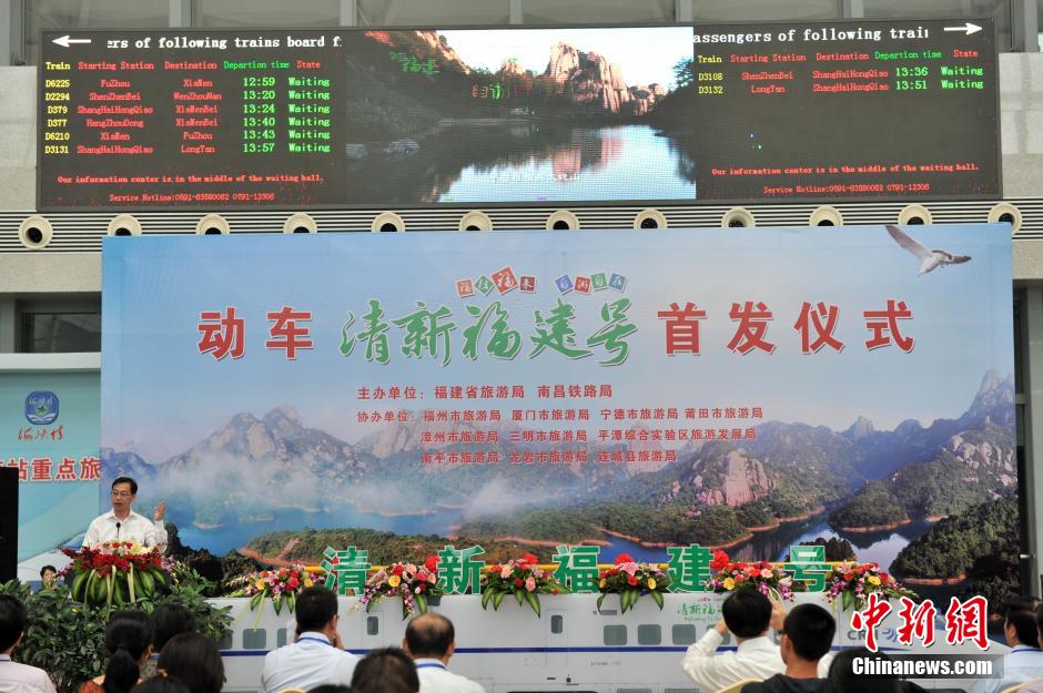 5月18日,“清新福建”号动车组冠名仪式在福州火车南站举行。上午9时36分,在动车组车身外彩绘“清新福建”字样的D2323次动车开往深圳,由此开启了福州开往深圳、上海、北京这三条热点旅游线路冠名动车组“清新福建”号的行程。中新社发 吕明 摄