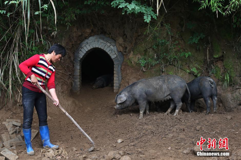 5月17日,沿着皖西大别山东线六毛公路溯源而上,记者走进安徽九棵松“正谷正养”黑毛猪养殖地,探访大别山古老的山谷正统养猪习俗,感受世外桃源般慢生活的安逸。在毛坦厂镇凤凰冲村的山坡上,密布着一个个小小的洞穴,这些“窑洞”内居住着当地养殖的黑猪们,临近中午时分,伴随着歌声的响起,它们鱼贯而出,统一进食,然后在野外山坡放养。图为当地村民在猪洞穴前面平整土地。中新社发 泱波 摄