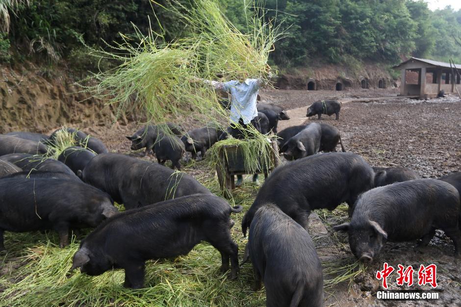 5月17日,沿着皖西大别山东线六毛公路溯源而上,记者走进安徽九棵松“正谷正养”黑毛猪养殖地,探访大别山古老的山谷正统养猪习俗,感受世外桃源般慢生活的安逸。在毛坦厂镇凤凰冲村的山坡上,密布着一个个小小的洞穴,这些“窑洞”内居住着当地养殖的黑猪们,临近中午时分,伴随着歌声的响起,它们鱼贯而出,统一进食,然后在野外山坡放养。图为黑猪在“窑洞”前散步。中新社发 泱波 摄