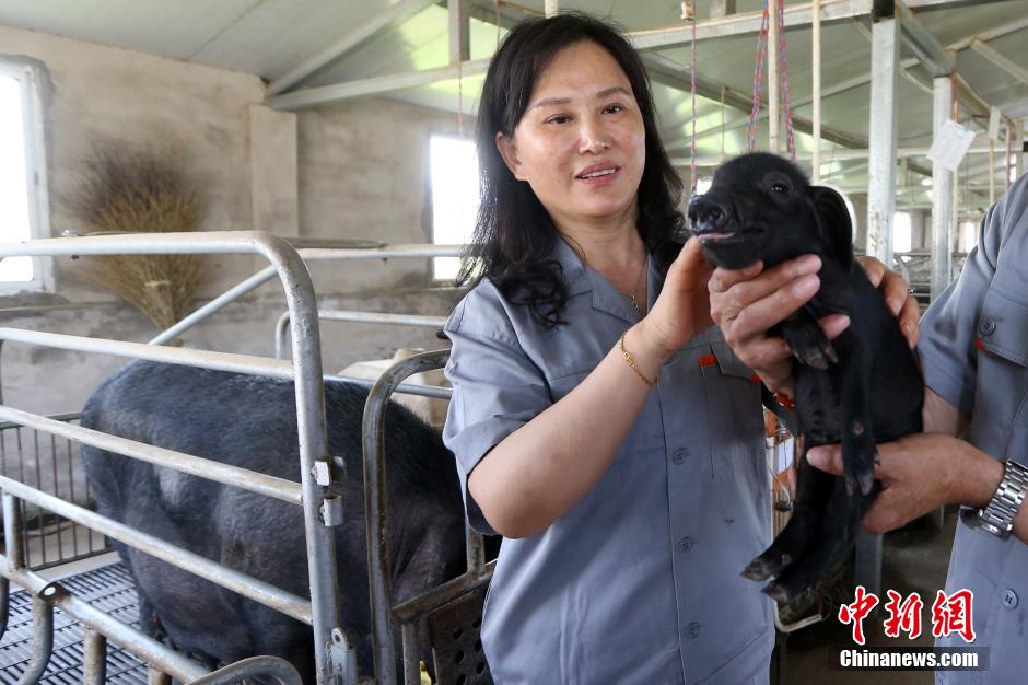 5月17日,沿着皖西大别山东线六毛公路溯源而上,记者走进安徽九棵松“正谷正养”黑毛猪养殖地,探访大别山古老的山谷正统养猪习俗,感受世外桃源般慢生活的安逸。在毛坦厂镇凤凰冲村的山坡上,密布着一个个小小的洞穴,这些“窑洞”内居住着当地养殖的黑猪们,临近中午时分,伴随着歌声的响起,它们鱼贯而出,统一进食,然后在野外山坡放养。图为黑猪产业奠基人、全国人大代表吴光纯查看猪仔的养殖情况。中新社发 泱波 摄