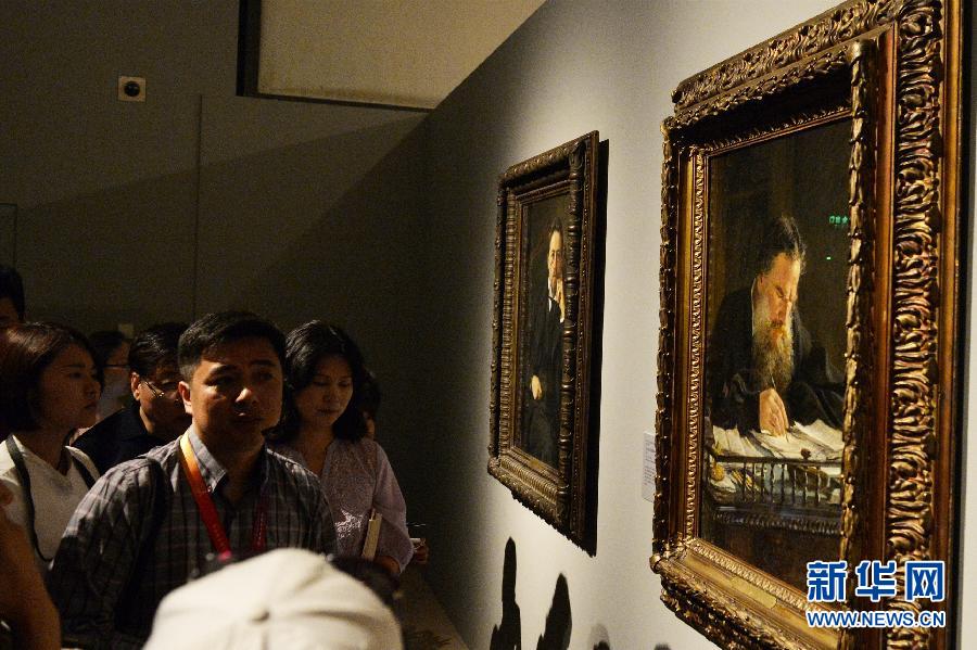 5月18日,在中国国家博物馆,“伏尔加河回响——特列恰科夫画廊藏巡回画派精品展”中方策展人王抒(左三)在为参观者讲解。新华社记者 高健钧 摄