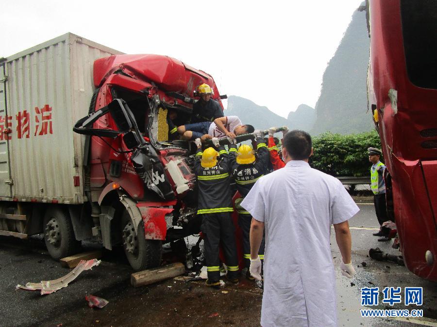 5月18日,广西贺州市钟山县消防官兵协力将被困在货车的随车人员救出。当日5时20分许,一辆货车在桂梧高速英家收费站一公里处与一辆满载37人的客车追尾,货车司机当场死亡,货车1名随车人员受重伤,客车上9名旅客不同程度受伤。新华社发(黄德堂 摄)