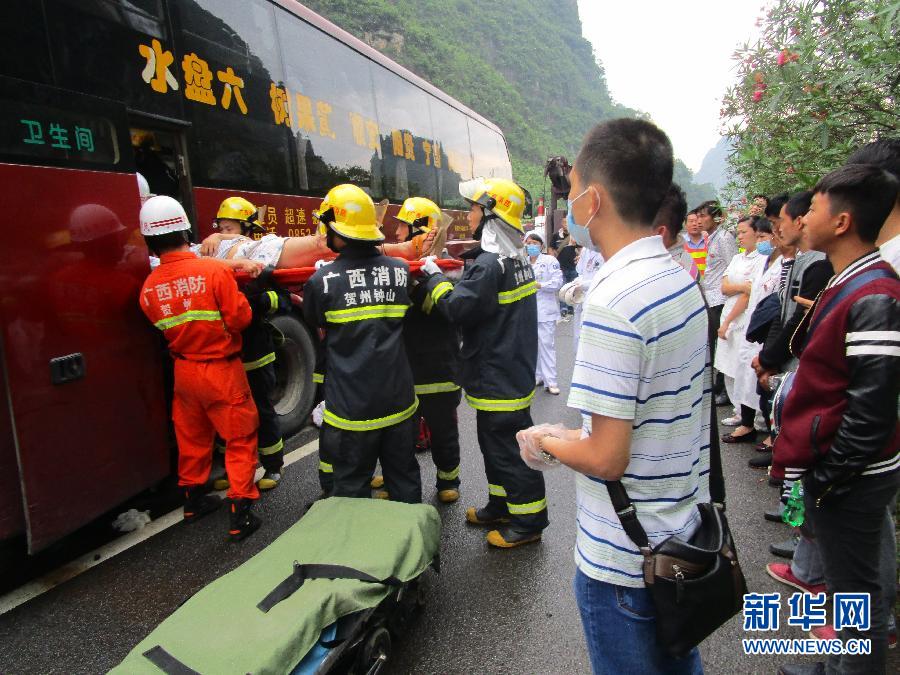 5月18日,广西贺州市钟山县消防官兵协力将客车内受伤乘客救出。当日5时20分许,一辆货车在桂梧高速英家收费站一公里处与一辆满载37人的客车追尾,货车司机当场死亡,货车1名随车人员受重伤,客车上9名旅客不同程度受伤。新华社发(黄德堂 摄)
