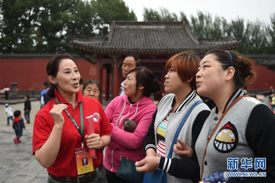 5月18日,一名志愿者(左一)在沈阳故宫博物院为游客进行讲解。新华社记者潘昱龙摄