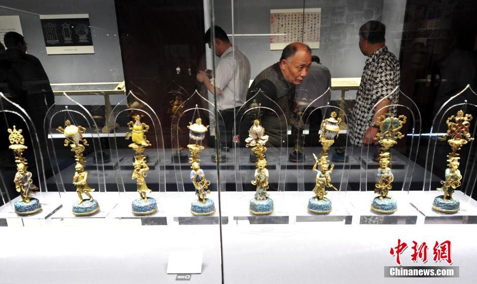 5月18日,民众观赏“铜胎掐丝珐琅天神八宝”文物。当日,在国际博物馆日来临之际,山东25家博物馆的“镇馆之宝”齐聚济南,319套涵盖陶器、甲骨、青铜、瓷器、玉器、金银器、书画、造像等多门类的珍贵文物亮相山东省博物馆,吸引众多民众前来一探“齐鲁瑰宝”真容。中新社发 张勇 摄