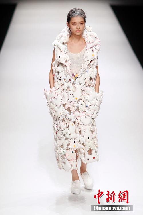 5月17日,模特在T台上展示湖北美术学院毕业生设计的时装作品。本届湖北美术学院毕业生作品发布主题是“乐·观”。 中新社发 盛佳鹏 摄