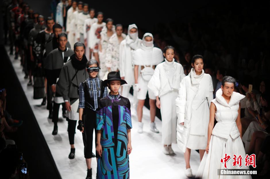 5月17日,模特在T台上展示湖北美术学院毕业生设计的时装作品。本届湖北美术学院毕业生作品发布主题是“乐·观”。中新社发 盛佳鹏 摄